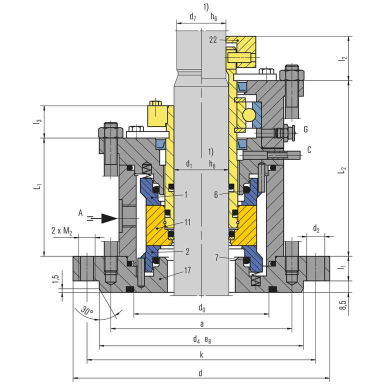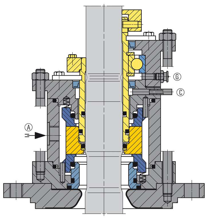 Doppeldichtung (mit integriertem Lager) für Stahlbehälter nach DIN 28136, Montageflansch gemäß DIN 28141 und Wellenenden DIN 28154.
