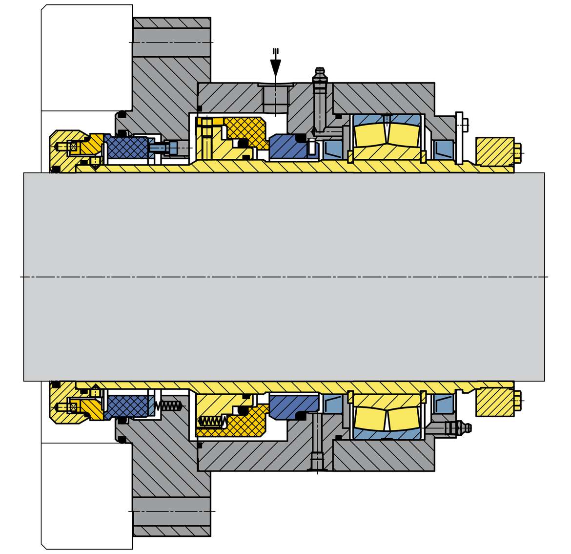 Zusätzlich muss die Wellenabdichtung aufgrund der Länge der Welle und der häufigen Temperaturwechsel ständige Axialbewegungen kompensieren. Deshalb wurde die SeccoMix R auf der Nicht-Antriebsseite mit einem Festlager und Abstreifern ausgerüstet. Das Lager fixiert die Dichtung axial auf der Wellenhülse der Gleitringdichtung und die Abstreifer ermöglichen eine Relativbewegung zwischen Welle und Wellenhülse. Mit dieser Modifizierung laufen alle Dichtungen an dem englischen Produktionsstandort mit Standzeiten von drei und mehr Jahren.